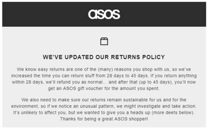 Under the new rules, if you return an item within 28 days, you will receive a full refund for your original payment method, just like before. If you return an item and it takes 29 to 45 days, you will now also get your money back, but instead you will receive it as an Asos Gift Card.