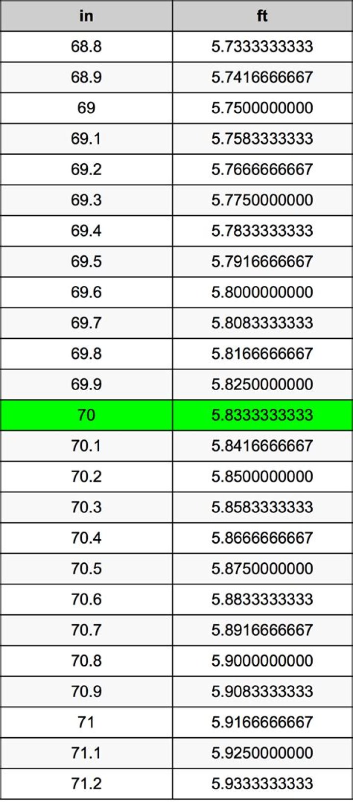 70 inches = 5.83 feet