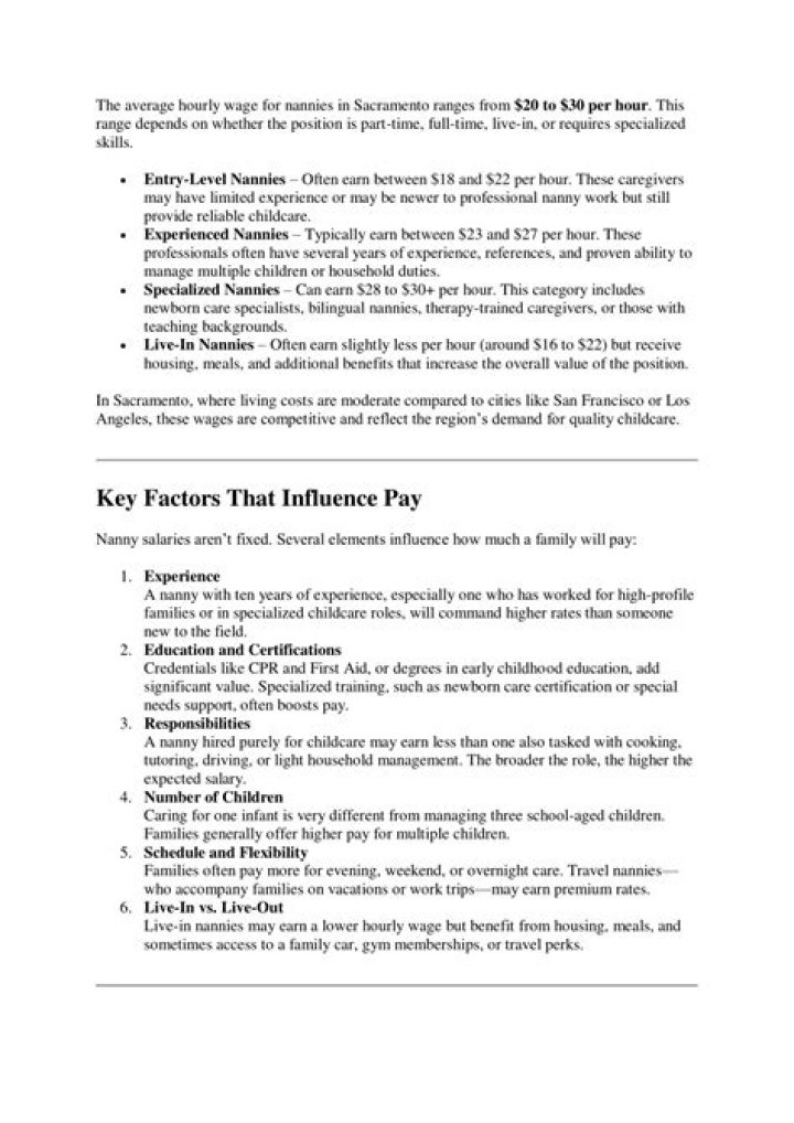 Some nannies are paid minimum wage. Others can start at $25 per hour. Consider what you want from your nanny (full-time or part-time, responsibilities, qualifications, experience, and education) before making a salary decision. The national average hourly rate for childcare is $ per hour.