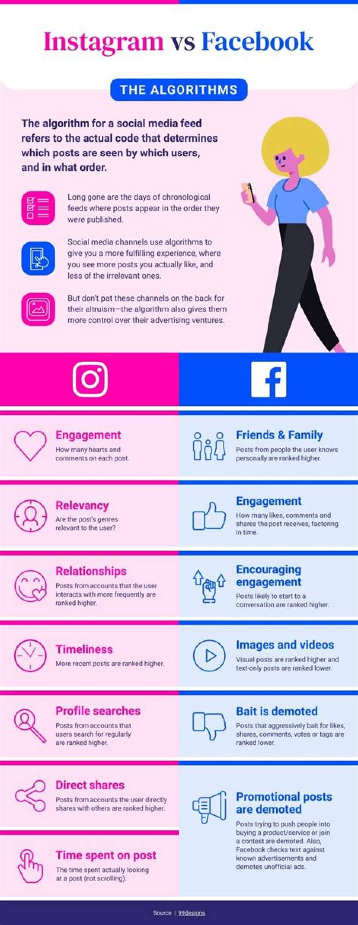 15 differences between Facebook and Instagram. Instagram only allows one link (biography). 3. Facebook is all about identity, emphasizing text first and then image. In comparison, Instagram is the image first and text second. 4. Consumers spend more time online on their mobile phone than on their desktop computer.