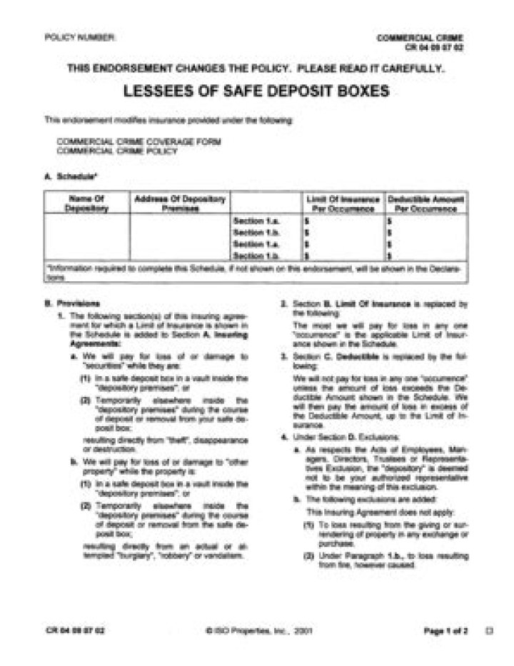 Lessees Of Safe Deposit Boxes Coverage Form I:
