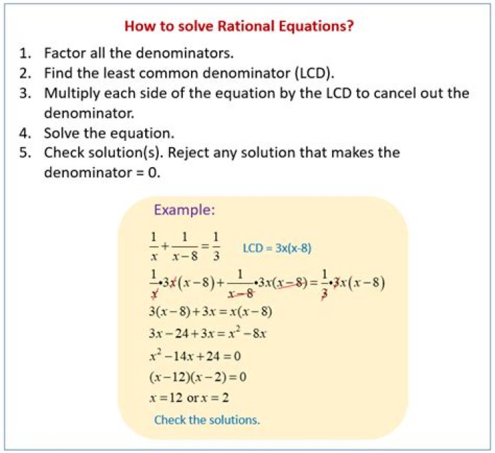 The steps to solve a rational equation are: Find the common denominator. Multiply everything by the common denominator. Simplify. Check the answers to make sure it's not a foreign solution.