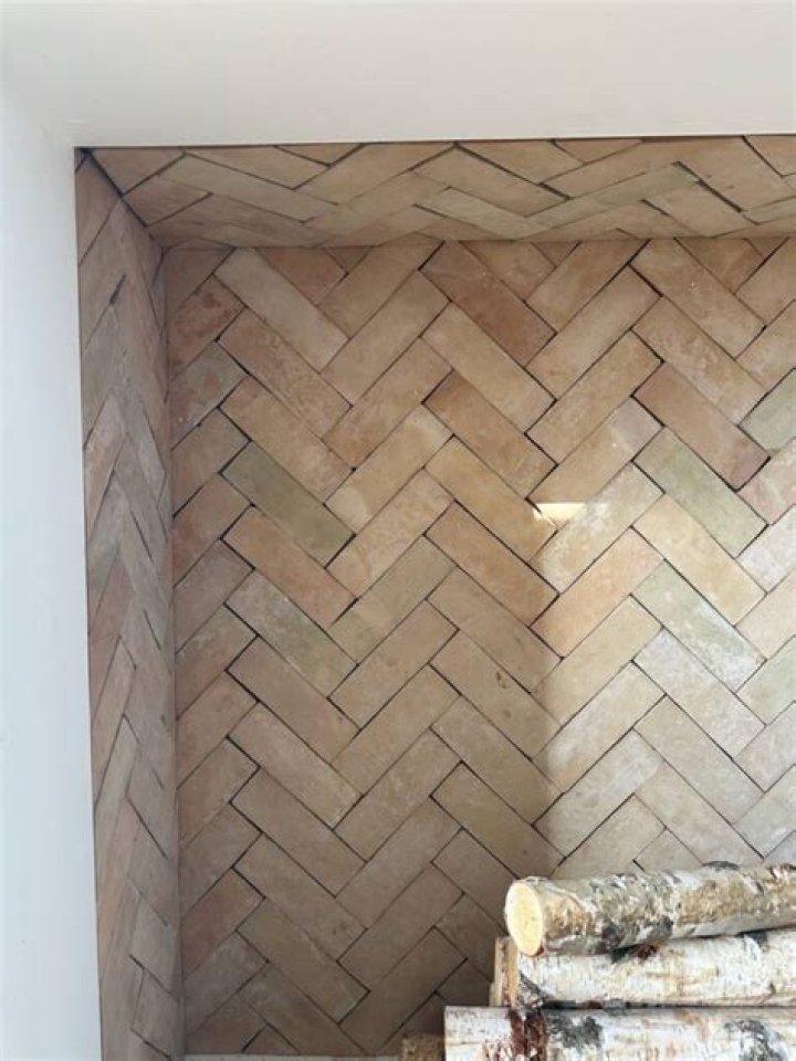 How is an uneven brick fireplace tiled?
