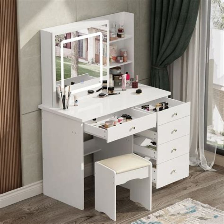 A makeup vanity is a piece of furniture designed for applying makeup and other personal hygiene items. Large storage space for many personal toiletries including hair brushes.