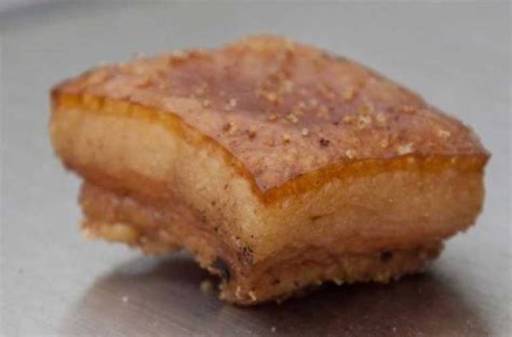 Cooking the pork in boiling water is the first step. They are then crushed into pieces of the size known in the art as lozenges and then refrigerated for at least four hours to allow the subcutaneous fat to solidify. Once the team has solidified, they are mated and rejected.