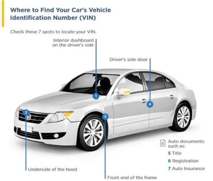 On the door frame On the car door On the dashboard on the driver's side Under the hood in front of the engine On the rear wheel arch, directly above the tire.